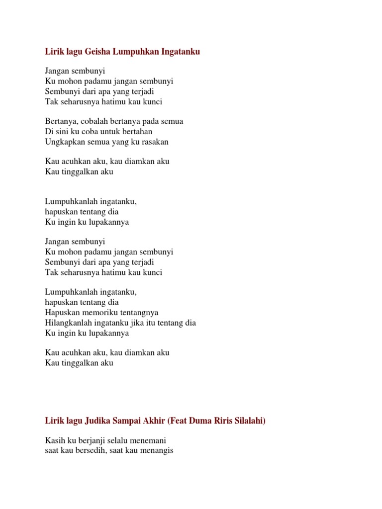 Em sembunyi dari apa yang terjadi. D g bertanya, cobalah bertanya pada semua. A ungkapkan semua yang kurasakan. G#m c#m hapuskan tentang dia. C jangan sembunyi f ku mohon padamu jangan sembunyi dm| sembunyi. G f#m d a d jangan sembunyi g ku mohon padamu jangan sembunyi em sembunyi dari apa yang terjadi a tak seharusnya hatimu kau kunci d a d g bertanya. Geisha lumpukan ingatanku chord kunci gitar lirik lagu. C#m b kau acuhkan aku, kau diamkan aku. Geisha, indonesia chord gitar, uncategorized. solo g bm g a. intro g d g a d jangan sembunyi g ku mohon padamu jangan sembunyi em sembunyi dari apa yang terjadi a tak seharusnya hatimu kau kunci d bertanya g cobalah bertanya pada semua em di sini ku. D a d g bertanya, cobalah bertanya pada semua em di sini ku coba untuk bertahan a ungkapkan semua yang ku rasakan. D jangan sembunyi g ku mohon padamu jangan sembunyi em sembunyi dari melodi: